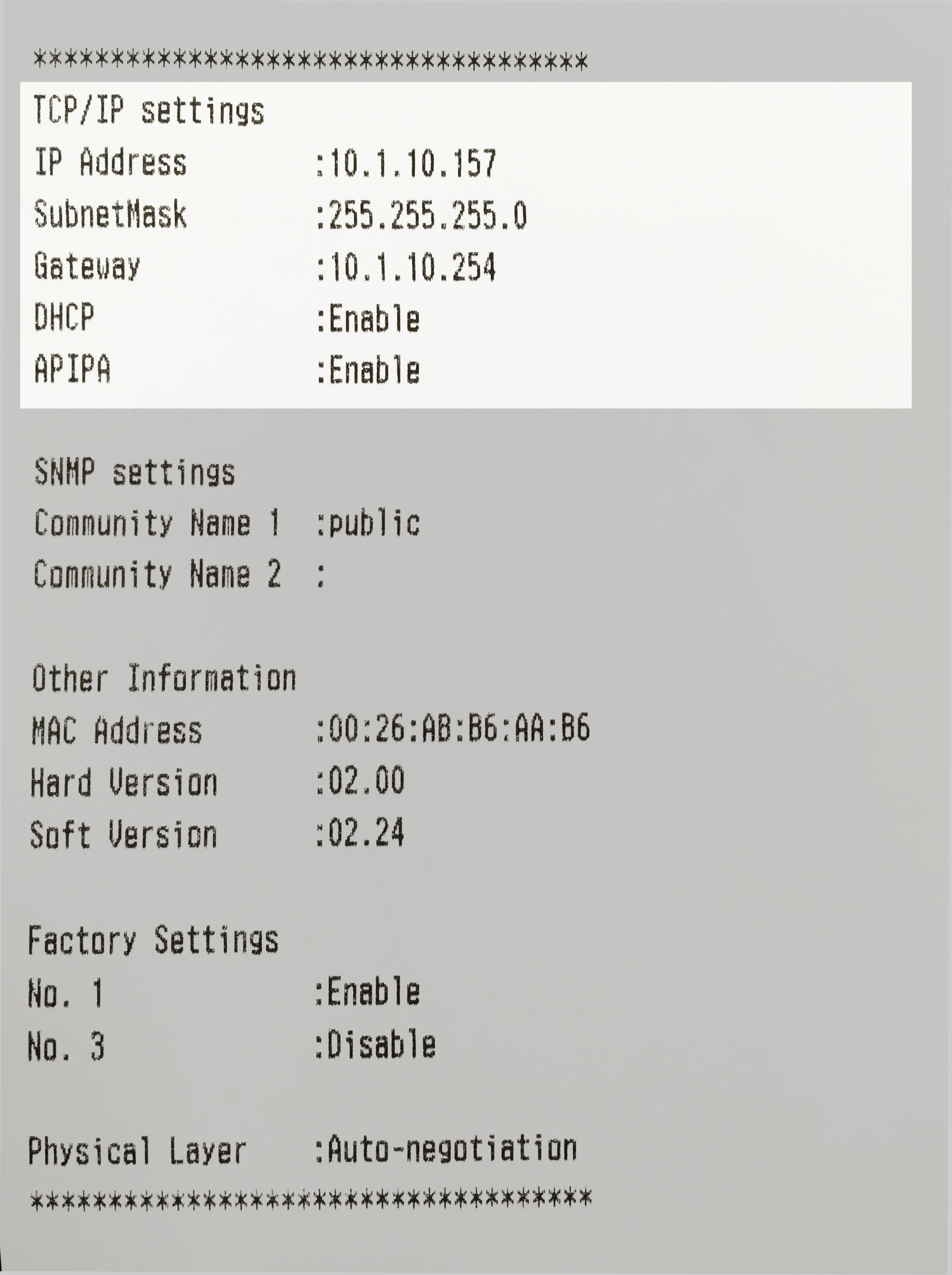 Một khi DHCP đã được thiết lập, bạn sẽ cần phải nhận thử nghiệm với các địa chỉ IP trên đó. Nếu bạn không còn có điều này, bấm và giữ nút 'PUSH' trên mặt sau của máy in trong khoảng 4 giây. Các máy in sẽ in ra các thiết lập mạng và bạn sẽ thấy địa chỉ IP được liệt kê lên đầu trang.